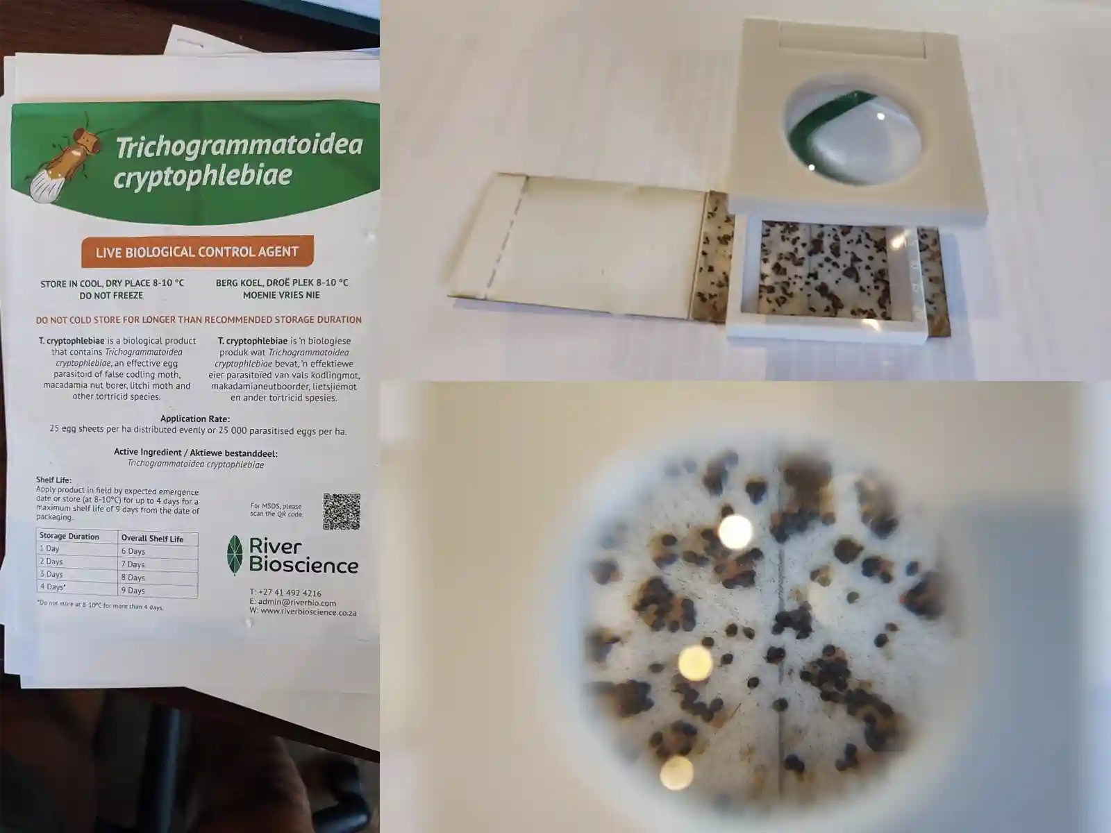 As part of our biological pest and disease control program we had to start with moth prevention and we followed the process of setting out 1000 eggs of a predatory mite on every 13th tree which in turn lays an egg in the eggs of the moths.
