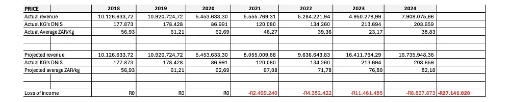 Over the period 2021 to 2024, WelMac suffered a loss of revenue of €1,507,834 (R27,141,000). The price per kilo fell due to the inventory that built up in 2020 and 2021 due to global lockdowns and transport problems. This decline was significant, reaching 63% in 2024.